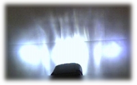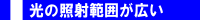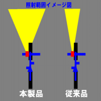 LEDは、その特性上、照射範囲が狭く指向性が高いのが一般的です。 よって、自転車などのヘッドライトとして使用した場合、1個のLEDを使用した従来品は正面以外は光が照射されにくい欠点がでてしまいます。 当社の製品は、3個のLEDを特殊に配置して、上記の欠点を抑えました。(左図参照) これにより、街乗りで周囲からの認知度が向上し、交通事故防止になり安全です。 次の写真は白い壁面に照射した時のものです。 |