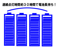 本製品は単3乾電池を4本使用します。 本製品は点灯回路に定電流回路を使用しておりLEDを安定して光らせ、かつ電池寿命が連続点灯時間で約30時間※2と長寿命です。 ※2・・・アルカリ乾電池使用時 |